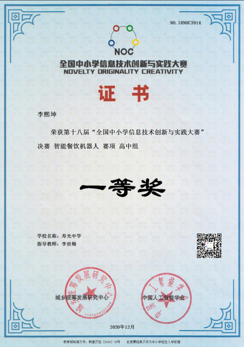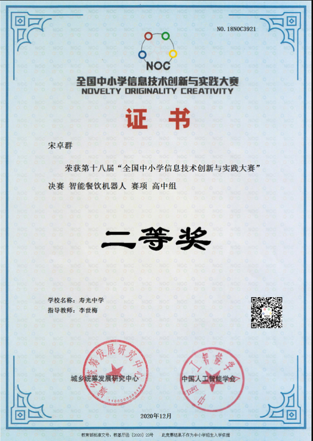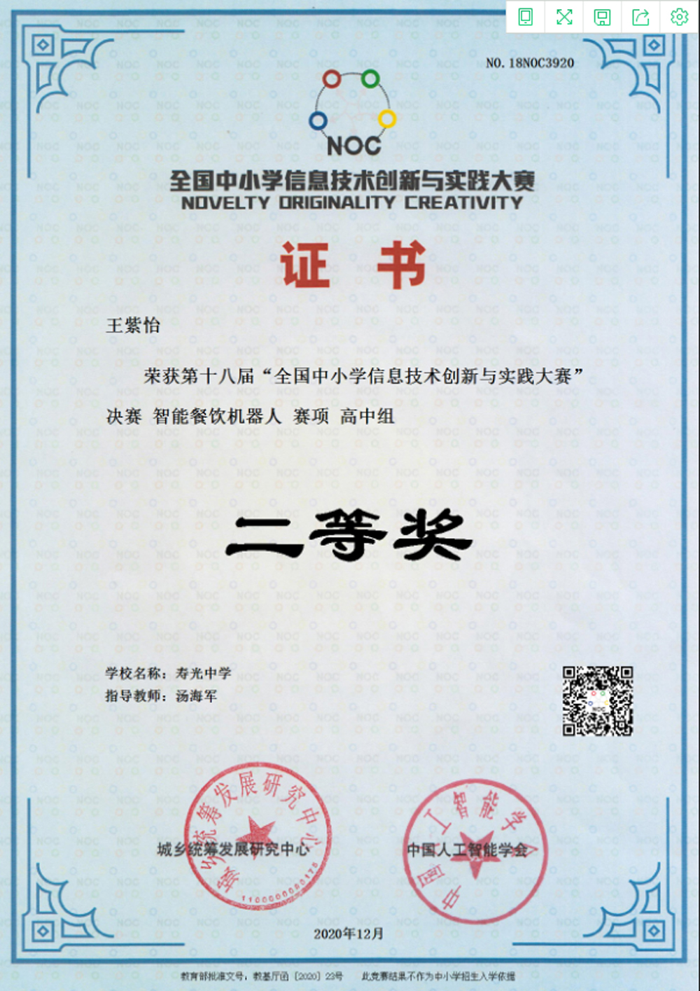12月5日至6日,在第十八届全国中小学信息技术创新与实践大赛(NOC)全国比赛中,寿光中学李熙坤、王紫怡、宋卓群、刘英瑞四名同学经过层层选拔入围智能餐饮项目决赛并取得优异成绩。李熙坤获得一等奖,王紫怡、宋卓群、刘英瑞分别获得二等奖。