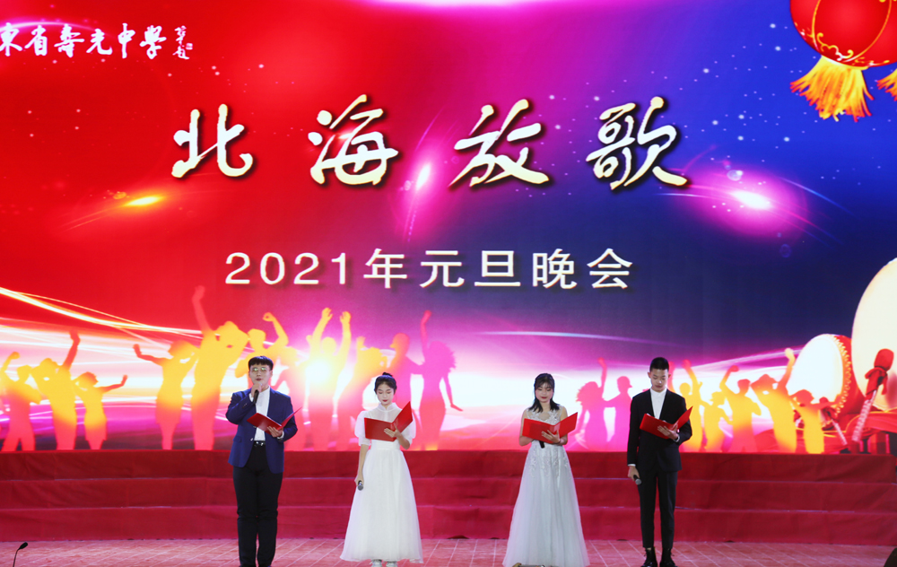 黄本东校长首先为本次元旦晚会做了热情洋溢的致辞,他总结了我校2020年所做的工作,肯定了取得的各项成绩,着重和同学分享了2020年高考的胜利。致辞的最后,黄校长送上了对同学们2021年的祝福:“祝大家新年快乐,大美幸福!愿同学们大鹏一日同风起,扶摇直上九万里!”