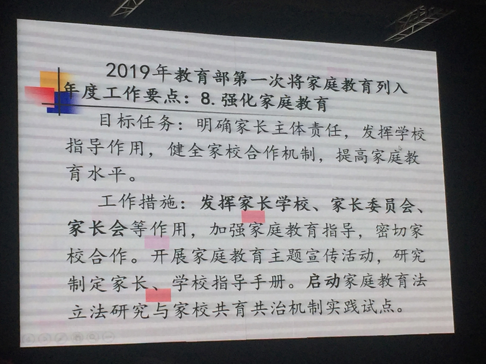 国家教育行政学院家庭教育研究中心主任许玉乾在“当前家庭教育的形势与任务”主题培训中,从“机遇空前、挑战依旧、前景光明”三个角度切入,站在宏观的角度,梳理了国家在家庭教育工作方面的相关政策。2019年教育部第一次将家庭教育列入年度工作要点,要求明确家长主体责任,发挥学校指导作用,家庭教育指导能力成为中小学教师必备的五种能力之一。