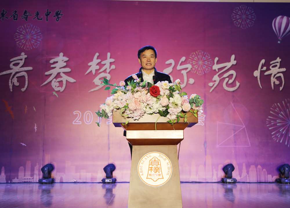 精彩的开场舞之后,黄本东校长为本次元旦晚会做了热情洋溢的致辞,他总结了我校2018年所做的工作,肯定了取得的各项成绩,着重和同学分享了2018年高考的胜利。致辞的最后,黄校长送上了对同学们新年的祝福:“希望大家在新的一年里,以梦为马,躬耕弥苑,为寿光中学新的发展、新的辉煌,添写自己最亮丽的一笔。我坚信,寿光中学的明天会因为大家的继续努力而更加辉煌灿烂!”