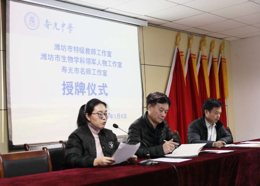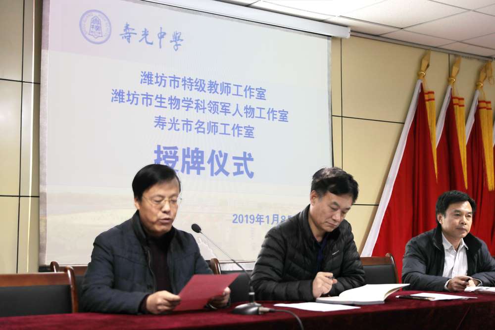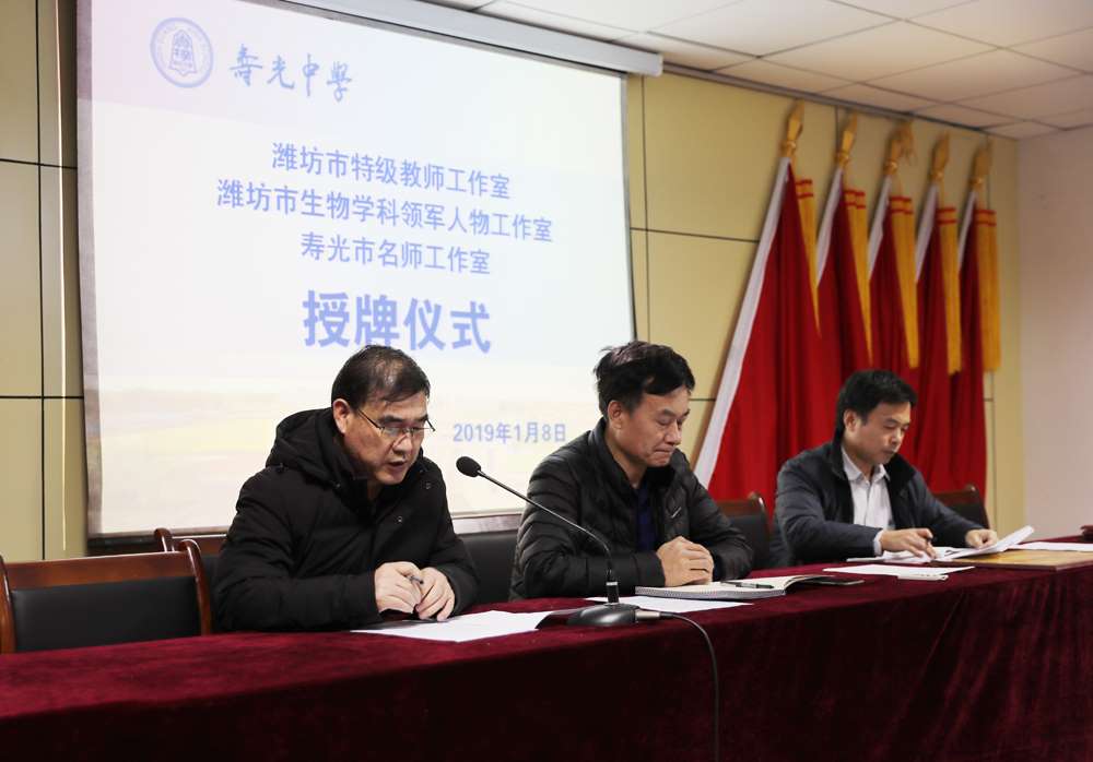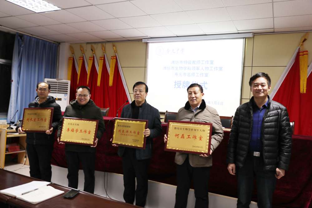 第三项,黄本东校长为潍坊市特级教师刘东兴工作室、潍坊市生物学科领军人物何磊工作室、寿光市名师李福学工作室、刘长宏工作室授牌。