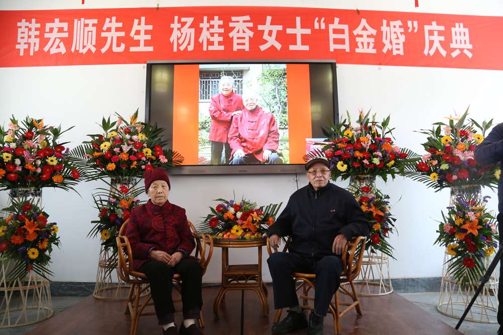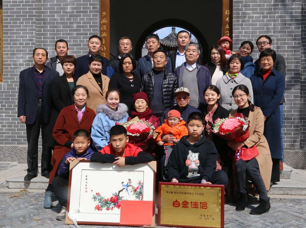 “执子之手与子偕老”,是很多人心心念念却很难实现的梦想,至于携手共度七十年,更是凤毛麟角,难得一见。而在3月23日的上午,春光明媚,晴空万里,北海书院里鲜花锦簇,人头攒动,86岁的寿光中学退休教师韩宏顺先生和91岁的杨桂香女士“白金婚”庆典正隆重举行。参加庆典的有校长、党委书记黄本东,副校长李福学,工会主任韩思端等学校领导,部分老师,寿光市传统文化办公室李海梅女士,韩老师的学生以及寿光报社和寿光市电视台的媒体朋友们。
