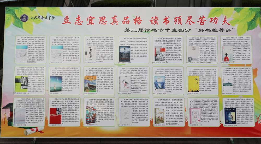 寿光中学第三届读书节活动同时结合“坚持立德树人、回归教育初心”教育理念大讨论活动以及“三个怎么办”、“四个做什么”大讨论活动和市教体局2019年“师德建设月”教育活动要求,扎实开展好每一项活动。活动期间将举行“好书推荐辞”评选、读书征文、经典诵读、读书励志活动、读书报告会、读书明星评选等多种形式的读书竞赛活动,进一步推动书香校园建设。