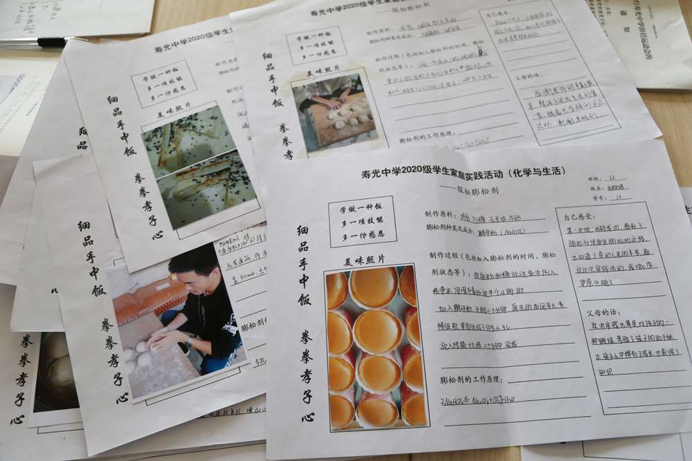 到家后,同学们在家长的配合和指导下,按照选择膨松剂——和面——发面——揉面——成胚-——蒸熟等步骤,开始了认真的制作。带着探究的兴趣,带着实践的快乐,跟家长共同体验了一把自制膨松剂的过程。返回学校后,部分学生带回了自己的成果。有的同学做了馒头,模样周正;还有的同学别出心裁,从网上自学了教程,做出了花样,有花朵,有刺猬,有小鸟。在实践过程中,同学们详细的记录了各自的制作过程和活动感受,把化学课堂上的学习转移到了厨房,寓教于生活。
