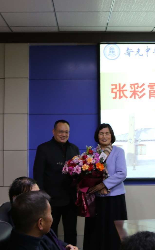 光荣退休,退休光荣。李福学副校长代表学校师生为张老师敬献了鲜花,赠送了纪念品。黄本东校长代表学校给张老师颁发了退休证书,,高度肯定了张老师在各个工作岗位作出的不平凡的工作业绩。他说,张彩霞老师无论在政治科教学、文综备考还是在学校女工工作等方面都非常好的起到了带头人的作用,是全校女工的杰出榜样,并且在任市人大代表期间积极通过社会活动对学校进行宣传,想法为学校发展和建设争取利益。张老师的退休是学校的一大损失,希望张老师继续关注关心学校的发展,多为学校建设出谋献策,希望张老师在即将开始的又一个五十五年生活充实、快乐、幸福。整个欢送会在温馨和谐,轻松愉悦。