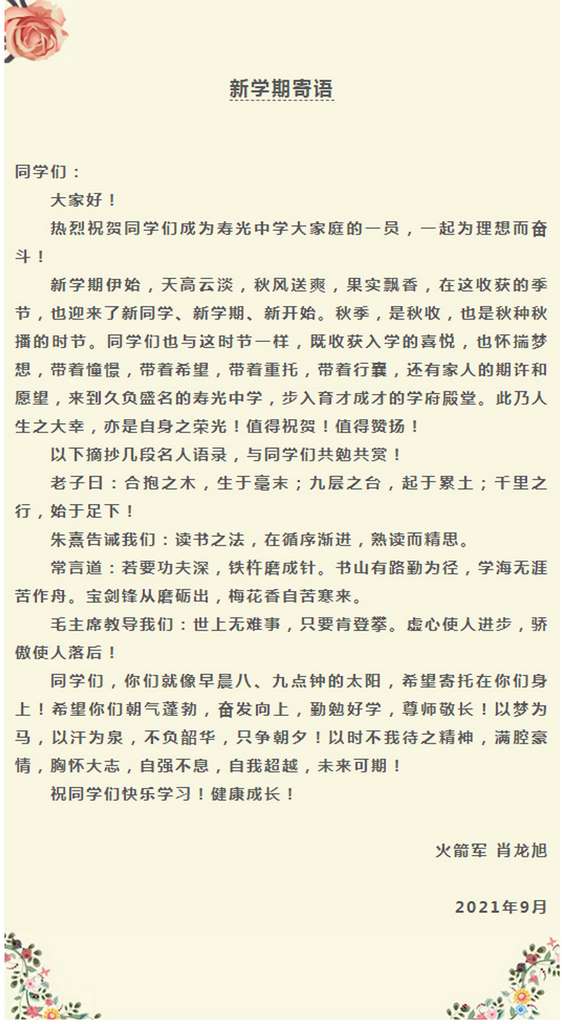 在杨校长发表开学致辞的同时,有一个插曲,院士校友肖龙旭给学校发来了新学年寄语,希望母校学子努力拼搏成为国家栋梁之才。