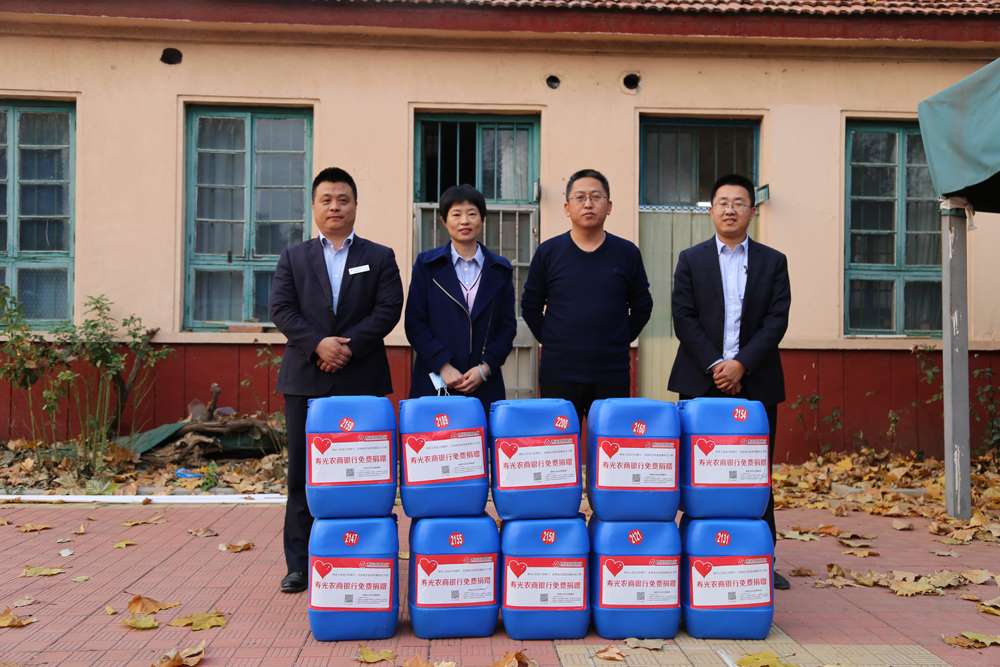 11月19日下午,寿光农村商业银行寒桥支行周秀丽主任一行三人来到寿光中学,向学校捐赠了次氯酸钠(1:100)消毒液10桶共250公斤,助力学校做好常态化疫情防控工作。寿光中学采购部主任李子修代表学校接收了捐赠物资。