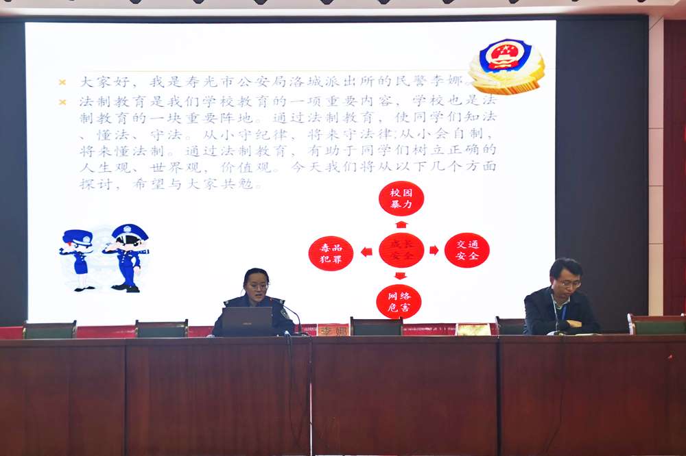 随后,全体同学到报告厅就座,聆听洛城街道派出所李娜警官为同学们做“拒绝欺凌,远离伤害, 做守法好少年”法制教育专题报告。讲解中,李警官重点就什么是校园暴力、校园暴力形成的原因以及遇到校园欺凌时该怎么办这几方面,结合一个个生动鲜活、触目惊心的案例进行了细致地讲述。她强调,为了避免成为被侵害的对象,同学们要会保护自己。平时钱财不要外露,在厕所、角落等校园暴力多发的地带,最好与同学结伴同行;与人友善,不与人结怨,以免被打击报复;与人有矛盾时,要宽容忍让,避免发生暴力冲突,更不要以暴制暴。
