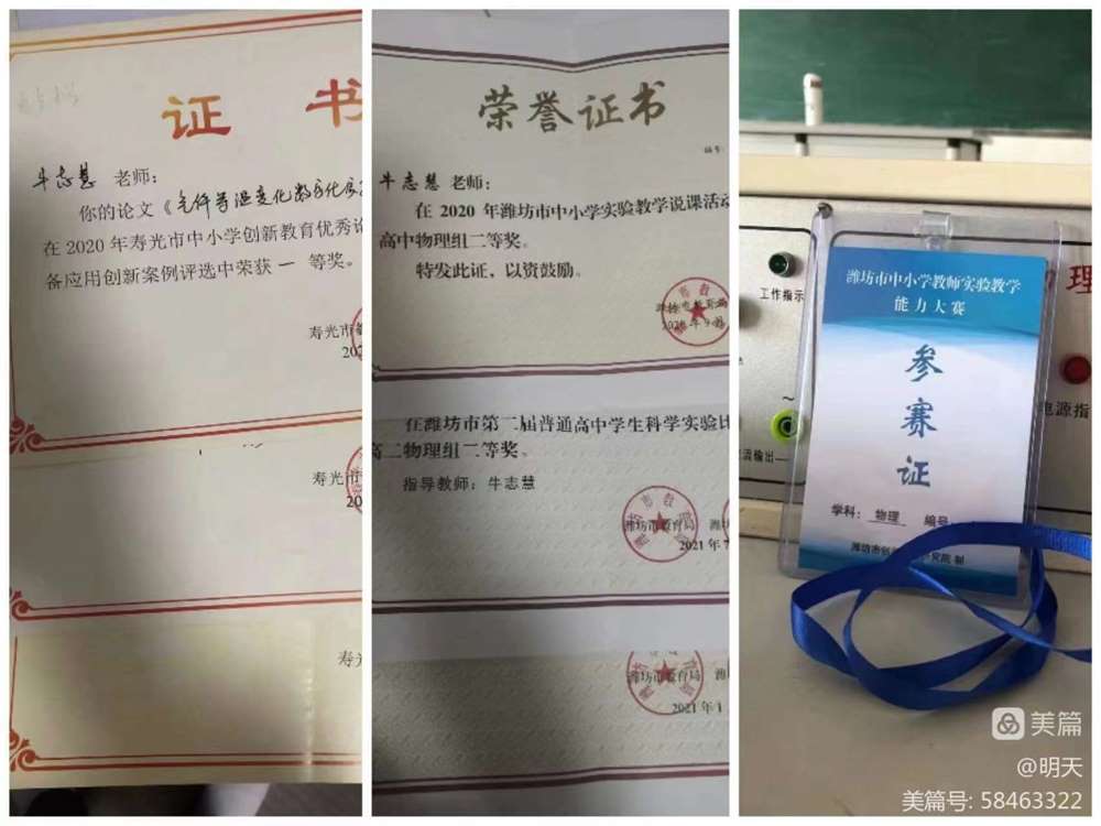2023年2月21日,在寿光市中小学实验教学能手评选中,寿光中学两名老师成绩优异再创辉煌。牛志慧老师获得高中物理组第一名,得分93分。郭翠丽老师获得高中化学组第一名,得分92.67分。