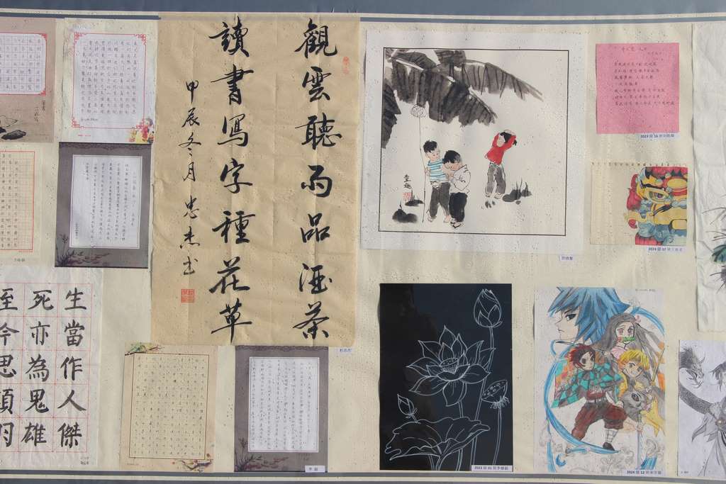 展览现场,一幅幅精美的作品映入眼帘,无论是水墨画、漫画、素描画、软笔书法、硬笔书法,都展现了学生们对艺术的热爱和对美的追求。这些作品不仅展示了师生们的艺术才能,也是对学生艺术表现力、鉴赏能力、合作精神的深度塑造,更是进行爱国主义教育的良好契机。