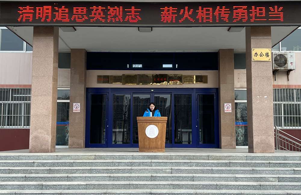 晨光熹微,国旗护卫队踏着铿锵步伐护卫五星红旗入场。升旗仪式上,全体师生肃立于晨风之中,注视着赤色旗帜迎着朝阳缓缓攀升。“在中华民族最危急的时刻,是他们用血肉筑起新的长城。”2024级程可馨同学作为学生代表,以“清明祭英烈,担当向未来”为题发表演讲。