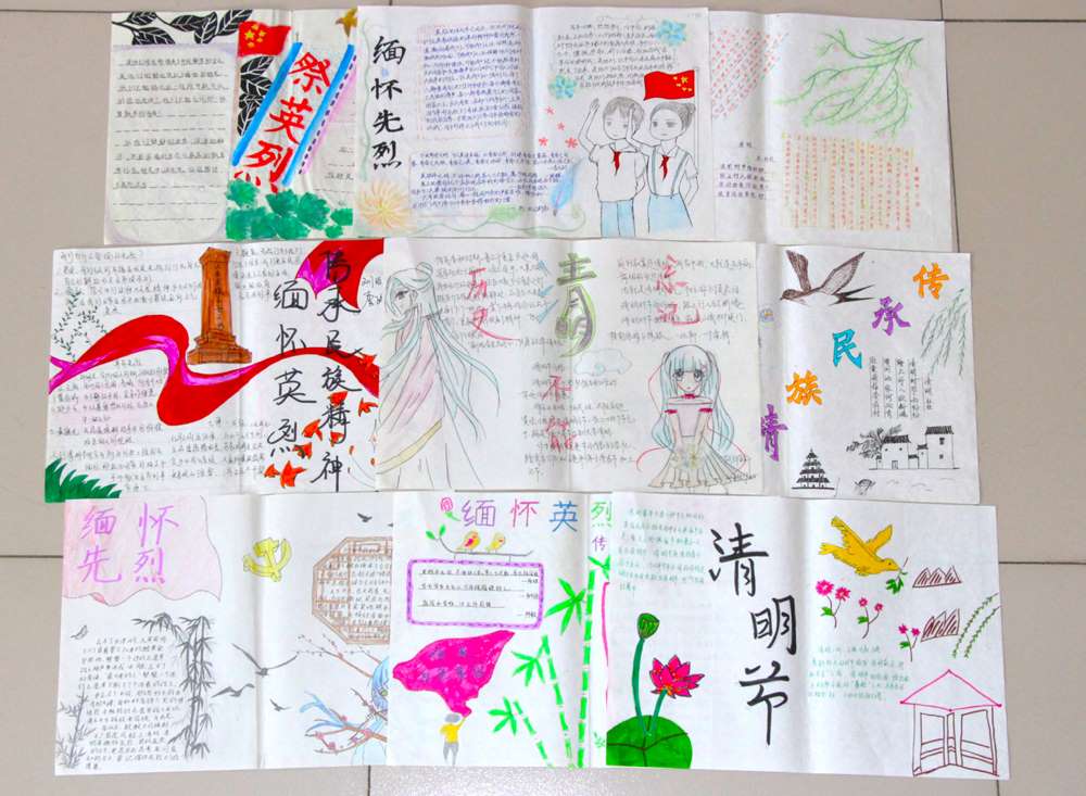 笔底春风传古韵,纸间万象绘初心。清明手抄报创作活动中,同学们化身传统文化传播者:水墨晕染的山水间勾勒出踏青扫墓的传统习俗,更有立体剪纸作品让纸鸢与菊花跃然纸上。从农耕时序到诗词意象,从抗疫英雄专题到航天精神礼赞,传统与现代交织出青春视角。