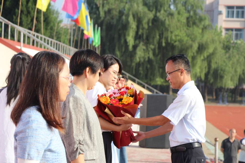 大会现场,学校党委副书记、纪委书记刘东兴宣读《寿光中学关于表扬2024-2025学年度弥苑先锋的决定》,随后主持人宣读了受表扬的师生名单。在热烈的掌声中,受表扬的教师代表上台接受学校领导的献花,荣获“刘林奖”的学生在全校师生的见证下接过荣誉证书。每一份荣誉,都是对师生们过去一学年辛勤付出、拼搏进取的肯定。他们是“真朴和乐”校训的践行者,更是全体寿光中学人学习的榜样,激励着大家在新学年以更昂扬的姿态追逐目标、突破自我。
