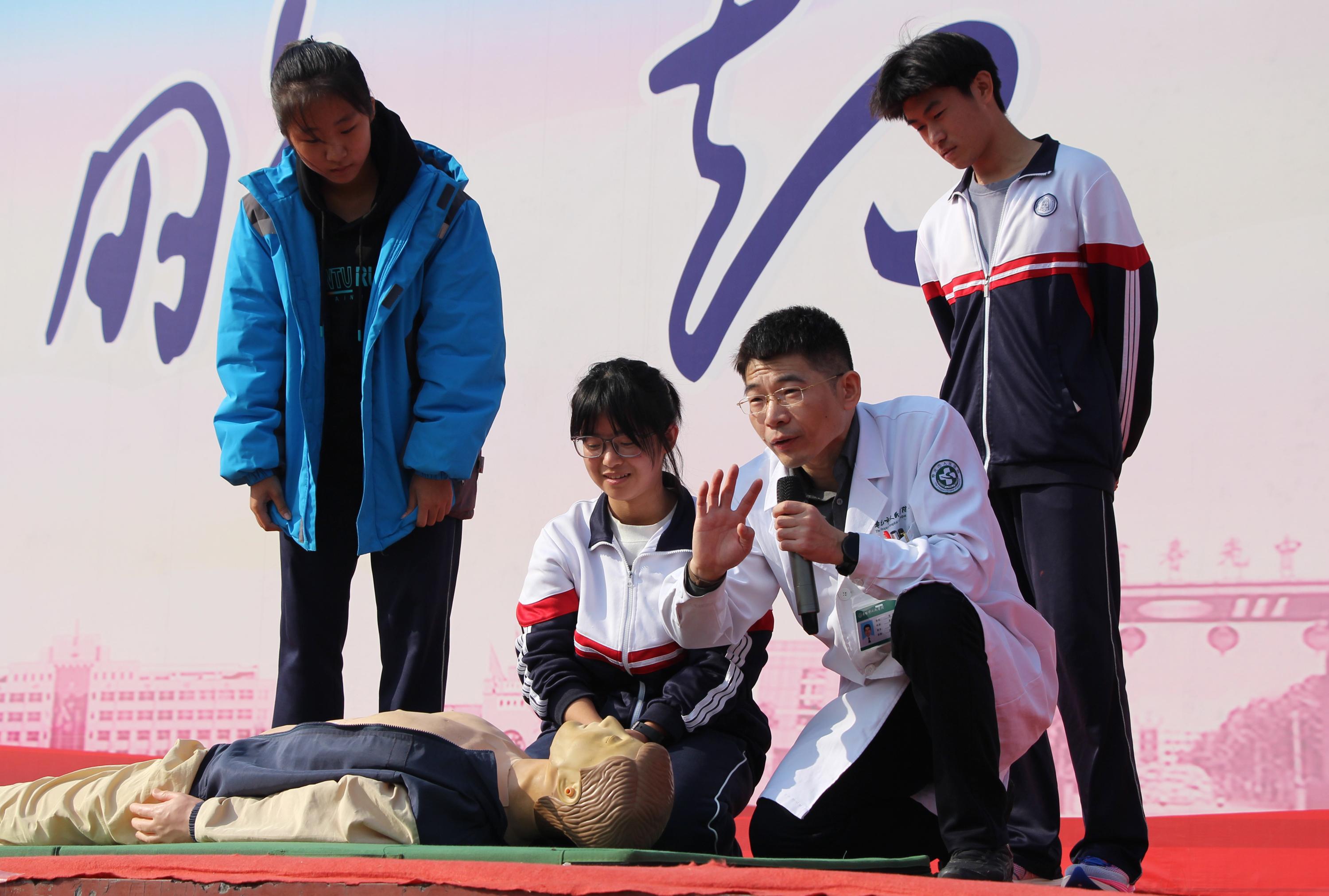 为强化师生疾病防控意识,提升突发疾病应急处置能力,11月5日上午,寿光中学特邀寿光市人民医院急诊科医生团队,在学校操场为高二、高三全体学生及全校教师开展急救知识专题培训。