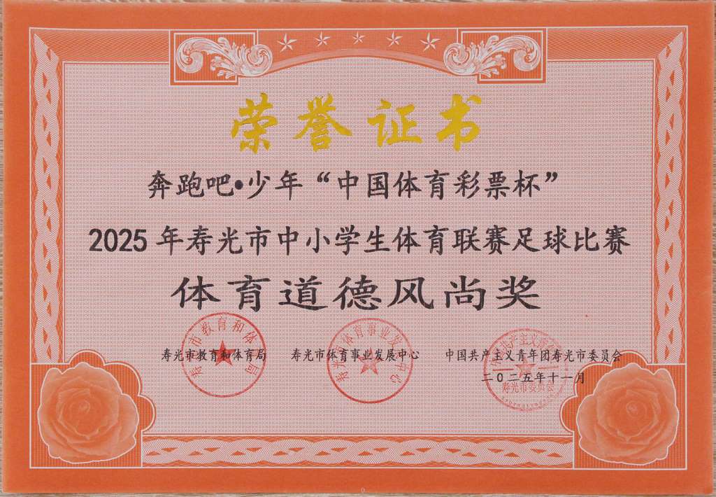 在12月3日闭幕的2025年“中国体育彩票杯”寿光市中小学生体育联赛足球比赛中,我校足球特色教学再结硕果:男子足球队勇夺冠军,女子足球队同样表现优异,获得第二名。同时,我校还荣获此次比赛的体育道德风尚奖。